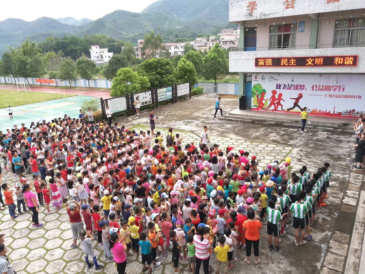 前中國青年足球隊主教練麥超,廣東省廣鋁公益基金會秘書長周楠,新興縣教育局及體育局領導、里洞鎮領導,前太陽神隊員及廣州聲色體育技術總監何錦波一行人來到里洞鎮中心小學,號召關注中國足球發展的熱心人士共同加入公益活動中。