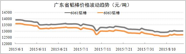 鋁棒市場價格持續(xù)下浮。截至8月20日,廣東省6061棒價格下浮至12,925元/噸,6063棒價格下浮至12,625元/噸,月化環(huán)比均下降1.5%。鋁棒價格下浮主要受原鋁市場價格下浮的影響,但鋁材生產(chǎn)旺季需求及鋁材出口穩(wěn)定增長因素將會對鋁棒價格形成有力支撐,預計6061棒的價格區(qū)間將回升在T60的水平(T60=13,300元/噸)。