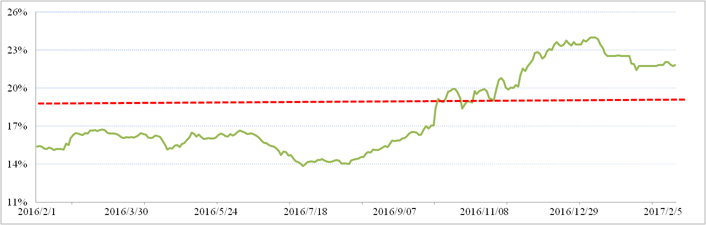 滬鋁三月比例價方面,2017年1月上期所三月期鋁結算價加權平均值為13,154.77元/噸,以17.6%作價2月份氧化鋁長單價為2,315元/噸,較1月份長單比例價上漲6.46元/噸。與現貨加權價格價差為654元/噸。1月份全國氧化鋁現貨加權價與滬鋁三月加權平均價實際折算比例為21.82%,較上月有所縮小。