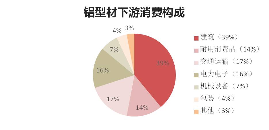 2017年鋁材的下游消費(fèi)持有相對(duì)樂觀的預(yù)估,這主要還是基于對(duì)宏觀經(jīng)濟(jì)整體終端需求的偏強(qiáng)判斷。在鋁材的下游消費(fèi)構(gòu)成中,主要在為建筑和交通、電力用鋁。其中,建筑(39%)、交通運(yùn)輸(17%)、電力電子(16%)、包裝(4%)、耐用消費(fèi)品(14%)、機(jī)械設(shè)備(7%)及其他(3%)。