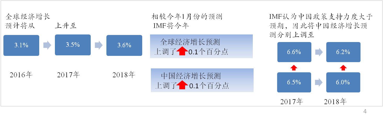 根據國際貨幣基金組織(IMF)《世界經濟展望》數據顯示,在金融市場以及制造業和貿易周期性復蘇支持下,全球經濟增長預計將從2016年的3.1%上升至2017年的3.5%和2018年的3.6%。相較1月份IMF將今年全球和中國經濟增長預測均上調了0.1個百分點。