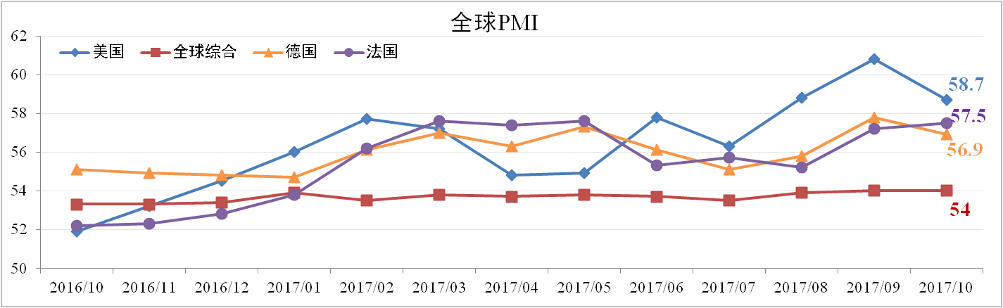 10月全球PMI為54點,與上月持平。其中,美國、德國PMI分別下滑2.1、0.9點至58.7、56.9點,法國PMI上漲0.3至57.5點。發達國家有小幅下滑,但整體仍處于較高水平,另外,德國三季度GDP為2.3%大超市場預期。