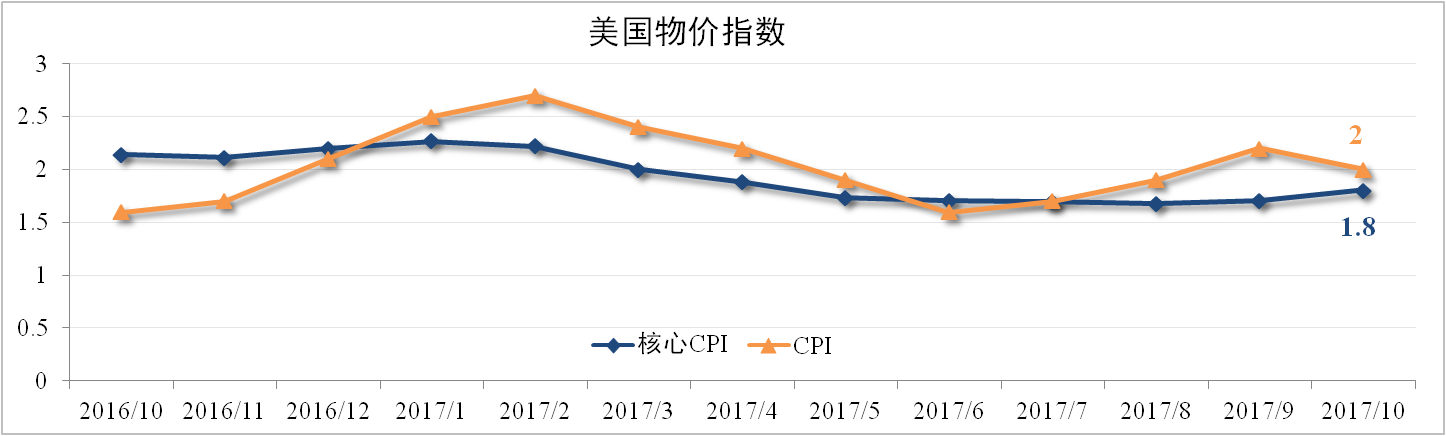 10月美國CPI為2%,較上月下滑0.2個百分點,復合市場預期,主要原因是颶風影響的能源供給恢復從而導致能源價格下跌。剔除能源項的核心CPI終結了連續4個月的持平,較上月擴大0.1個百分點報1.8%,超出市場預期。