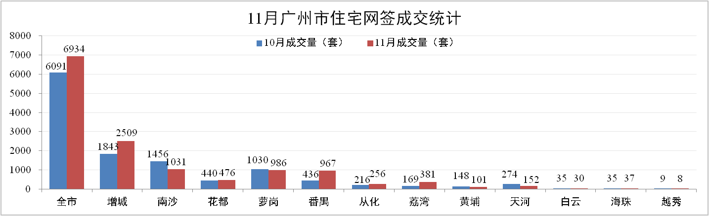 11月,廣州一手住宅網(wǎng)簽量成交6,934套,同比下降26.69%,環(huán)比上升13.84 %,大盤整體帶動(dòng)市場(chǎng)上揚(yáng)。