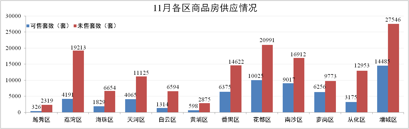 11月份廣州住宅地產(chǎn)去化周期為9.4個(gè)月,環(huán)比10月增加1.6個(gè)月,總體庫(kù)存量為763.68萬(wàn)m²,增城、花都等熱門區(qū)域由于新批預(yù)售集中在11月,拉動(dòng)整體庫(kù)存量增加。