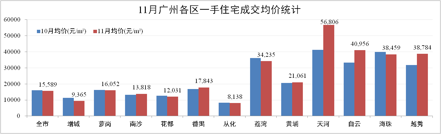 網(wǎng)簽價(jià)方面:11月份廣州一手住宅成交均價(jià)15,589元/m2,環(huán)比下跌3.10%。其中,增城成交均價(jià)僅為9,365元/m2,環(huán)比下跌16.72%。市內(nèi)核心區(qū)域均有不同程度升幅,整體拉動(dòng)市場(chǎng)均價(jià)平穩(wěn)。