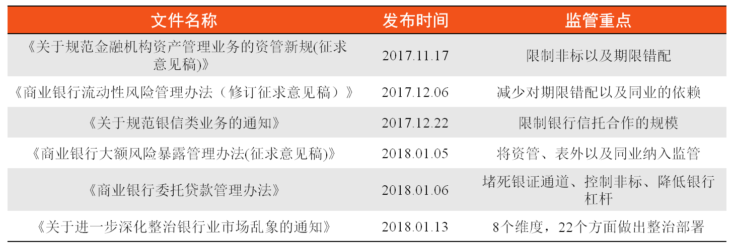 2017年11月17日至2018年1月13日,監(jiān)管層連續(xù)發(fā)出多道監(jiān)管政策,主要涉及銀行業(yè)。從所涉內(nèi)容看,基本實(shí)現(xiàn)了全面無(wú)死角監(jiān)管,非標(biāo)準(zhǔn)化資產(chǎn)以及通道業(yè)務(wù)基本被堵死。由于資金供給收縮,資金將通過(guò)標(biāo)準(zhǔn)化資產(chǎn)流向新興產(chǎn)業(yè)部門(mén),房地產(chǎn)、過(guò)剩行業(yè)以及融資平臺(tái)利率將有所上升。