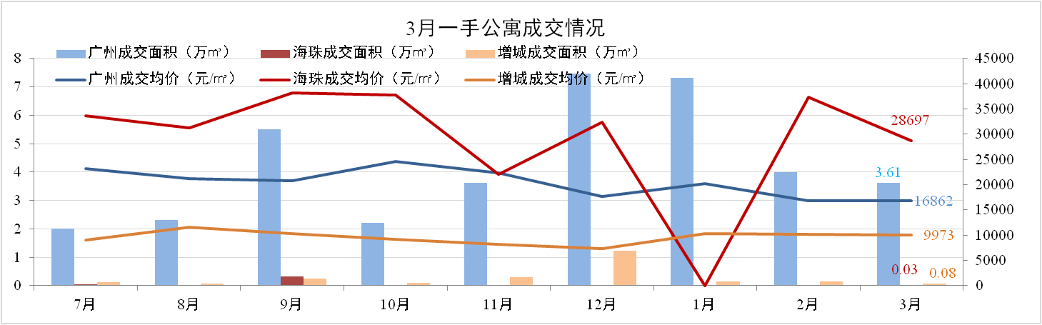 3月廣州一手公寓成交600套,成交面積3.61萬㎡,環(huán)比下跌0.3%。全市成交均價16,862元/㎡,環(huán)比上升2%。海珠、增城兩區(qū)成交量式微,價格保持穩(wěn)定。