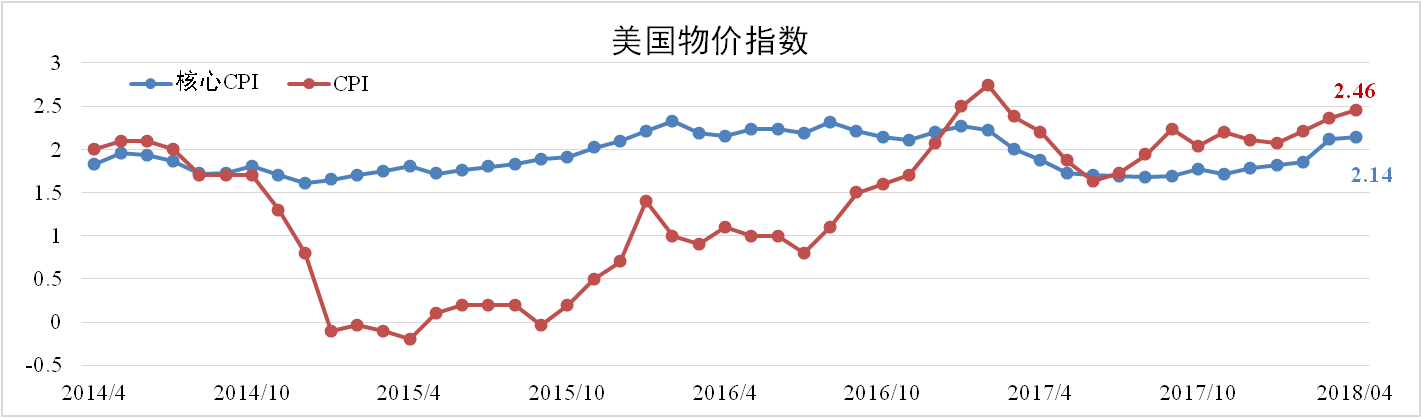 4月份美國CPI為2.46%,較上月擴大0.1個百分點,核心CPI為2.12%,較上月擴大0.02個百分點。通脹雖不及預(yù)期,但均高于3月。