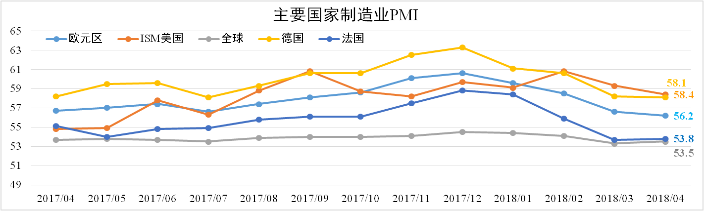 全球經(jīng)濟景氣度有所回升。據(jù)IHS與摩根數(shù)據(jù)顯示,4月份全球制造業(yè)PMI為53.5,較上月擴大0.2個百分點。其中,4月份ISM美國制造業(yè)PMI為57.3,較上月大幅收縮0.9個百分點,德國下滑0.1個百分點至58.1,整體平穩(wěn)。