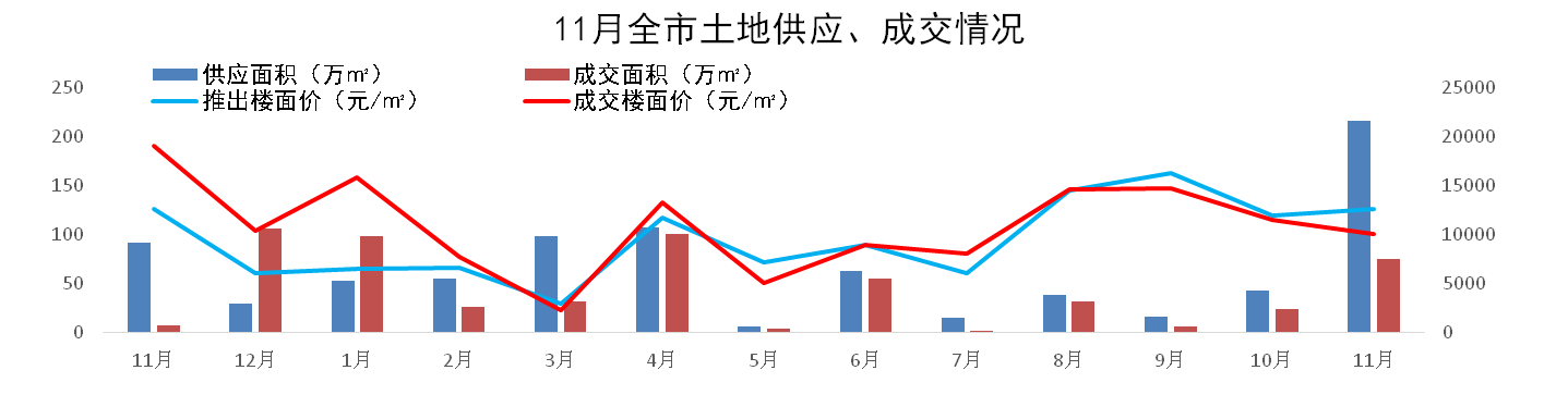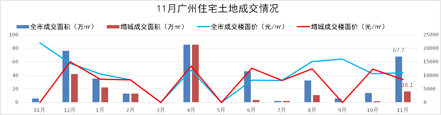 11月廣州市共推出26宗地塊,分別為25塊住宅用地和1塊商業(yè)用地,推出面積216.4萬㎡。商住用地共成交12宗,成交面積74.7萬㎡,成交樓面價10045元/㎡。