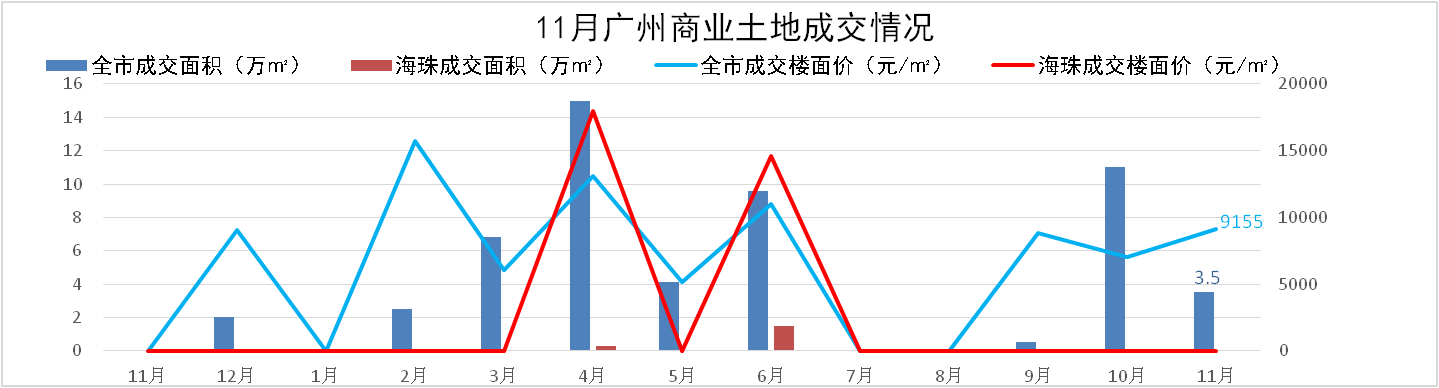 全市:11月共成交2宗商業(yè)地塊,成交面積3.5萬㎡,成交樓面價9,155元/m2,無溢價;琶洲區(qū)域暫無土地成交。