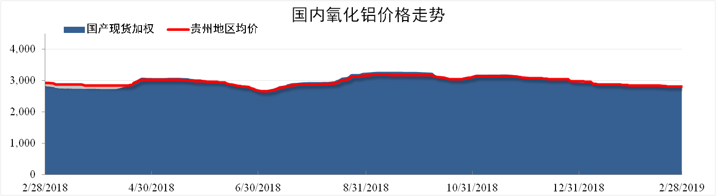 截至2月28日,國產(chǎn)氧化鋁現(xiàn)貨加權均價為2812元/噸,同比下降0.81%,環(huán)比下降2.18%。貴州地區(qū)氧化鋁現(xiàn)貨加權均價為2829元/噸,同比下降3.37%,環(huán)比下降2.22%。