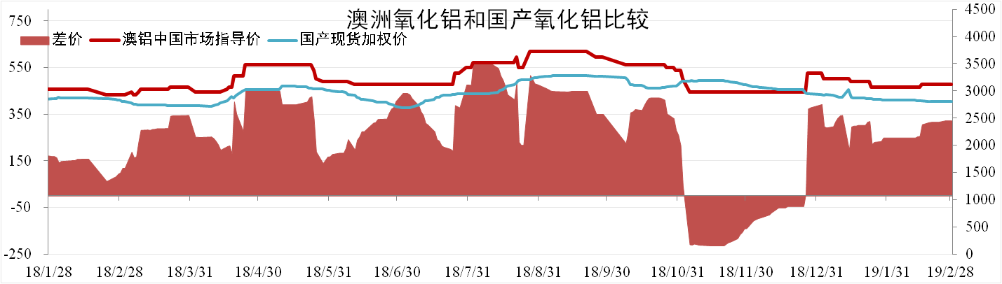 截至2月28日,國產(chǎn)氧化鋁現(xiàn)貨加權均價為2812元/噸,環(huán)比下降2.41%。澳鋁中國市場指導價為3108元/噸,同比上漲3.9%,國產(chǎn)氧化鋁價格較澳鋁指導價低296元/噸。