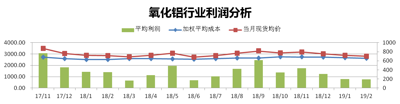 2月份國內(nèi)氧化鋁加權平均成本為2622元/噸,較上月下降2.02%。當月全國氧化鋁現(xiàn)貨成交均價為2812元/噸,較上月下降2.19%。理論氧化鋁行業(yè)平均利潤水平為190元/噸。