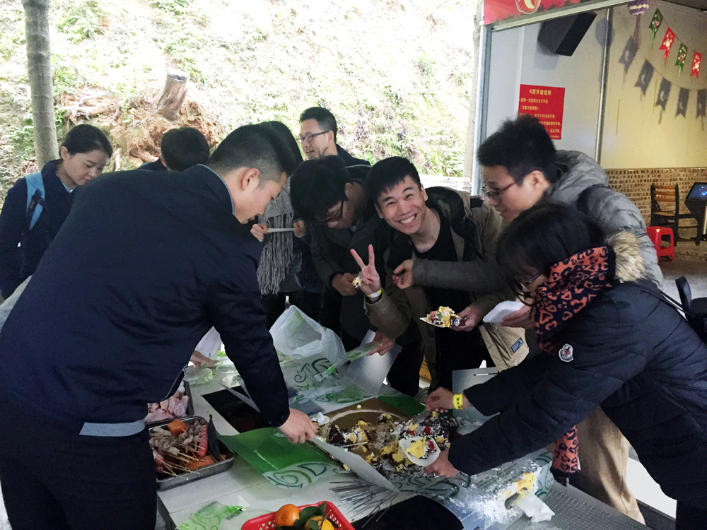 當天陰雨綿綿,寒風來襲,即使與預想的明朗天氣大相徑庭,但仍然沒有影響員工們出游的好心情。中午,大巴從集團本部出發,抵達大夫山森林公園。燒烤前,活動負責人拿出精心準備的生日蛋糕,在現場為11月生日的壽星們慶生,讓大家參與了一次新奇的戶外慶生會。小小的蛋糕寄托了大家對壽星們的祝福。